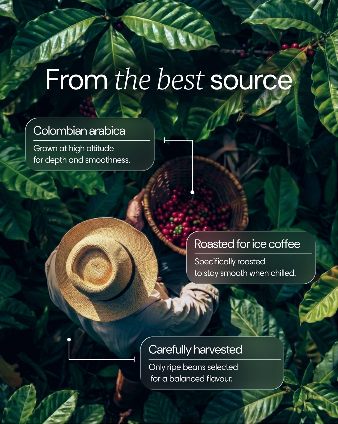 Unser Protein Eiskaffee kombiniert 100 % kolumbianischen arabica Kaffee mit grasgefüttertem Whey aus Neuseeland. Der Kaffee wird gefriergetrocknet, um das Aroma zu bewahren, und das Whey stammt von Kühen, die mindestens 350 Tage im Jahr auf der Weide stehen. Eine reine Alternative mit 21g Protein und 35–45mg Koffein.